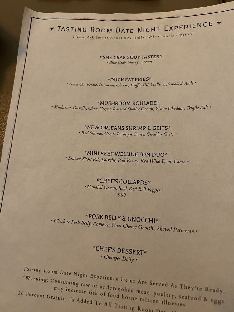 At the time of purchase, you are only charged the $ for the Tasting Room Date Night Experience. . percent sales tax, percent gratuity, and any beverages or extras are paid on the day of the event. Please note that the day and time you select for pick up, will actually be the date and time you are selecting to dine in. Available seating times for this event are from pm until pm, daily.PLEASE NOTE: We are unable to offer substitutions, or accommodate dietary restrictions or food allergies for this event at this timeThis purchase is non-refundable