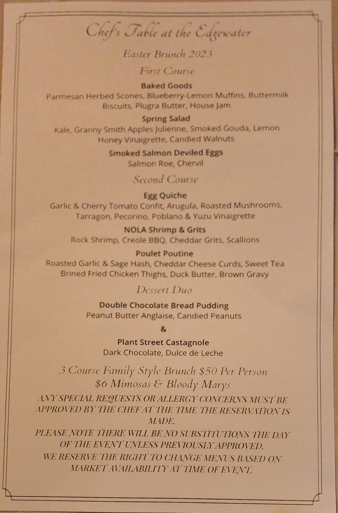 On Easter Sunday, The Chef's Table at the Edgewater will be offering a -course family style brunch for $ per person. Seating is limited, and pre-paid, non-refundable tickets can be purchased here on our website. Beverages, . percent tax, and percent gratuity will be paid for on the day of the event. For parties of larger than , please call the restaurant at --. Seating time begins at : am, and ends at : pm.All allergies must be approved by our culinary team at the time of purchaseWe Reserve The Right To Change Menus Based On Market Availability At The Time Of The Event Without NoticeThis Is A Non-Refundable Pre-Paid Event -- All Purchases Are Final